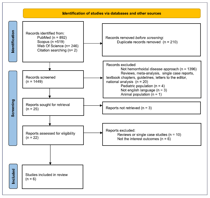 The search was carried out according to the following search query: ((Cirrhosis) or (“chronic liver disease”)or(“portal hypertension”)) AND ((hemorrhoid) OR (haemorrhoid) OR (“hemorrhoidal disease”)OR(“haemorrhoidal disease”)OR (sclerotherapy) OR (“rubber band ligation”)OR(“Infrared coagulation”) OR (cryotherapy) OR (“radiofrequency ablation”)OR (“laser therapy”)OR(“diathermy”)OR (“hemorrhoidectomy”) OR (“hemorrhoidopexy”)OR (“PPH”)OR(“HAL-RAR”)) AND NOT ((varices) OR (carcinoma) OR (gastric) OR (scar)).