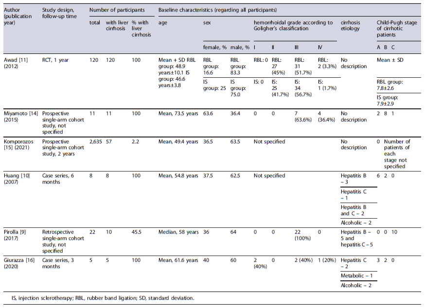 The average age (mean + SD) of cirrhotic patients managed with RBL was 64.0 ± 12.5 years in Komporozos’s study and 48.9 ± 10.1 years in Awad’s article. In both studies, treated patients were predominantly male (from 83.3% to 91.2%). Exclusion criteria included colorectal carcinoma in Komporozos’s study and thrombosed hemorrhoids, anal fistulas, or perianal abscesses in Awad’s study.