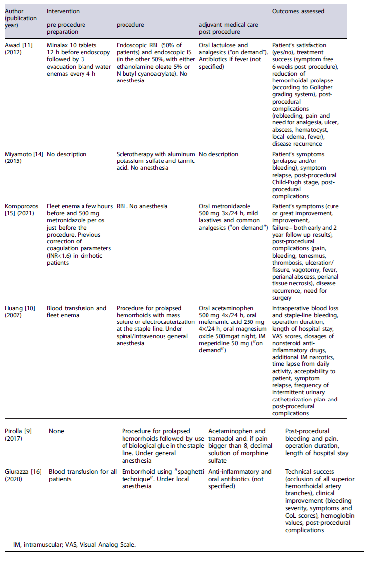 Data were extracted using a defined spreadsheet and included study design, inclusion criteria, overall number of patients and percentage of those with liver cirrhosis, baseline characteristics of all included patients (age, sex, hemorrhoidal degree according to Goligher’s classification, liver cirrhosis etiology and Child-Pugh staging, applied intervention characteristics (pre-procedure preparation, procedure and adjuvant medical treatment post-procedure), follow-up period, and evaluated outcomes. Regarding efficacy outcomes, the variables considered were symptomatic improvement, patient satisfaction, and improvement in quality of life, disease recurrence/need for surgery, and/or hemorrhoidal prolapse reduction in anoscopy. As for safety outcomes, the reported adverse events were analyzed for each intervention, such as bleeding, pain, ulceration, abscess, tenesmus, local edema, and fever. Most of the studies only reported the presence or absence of each post-procedural adverse event, with the exception of Pirolla et al.’s [9] study, where pain was graded according to a scale from 0 to 10 [10], and Awad et al.’s [11] study, where rebleeding was defined as anal bleeding with two separate bowel movements or massive bleeding that required further treatment occurring 1 month after the procedure [12].