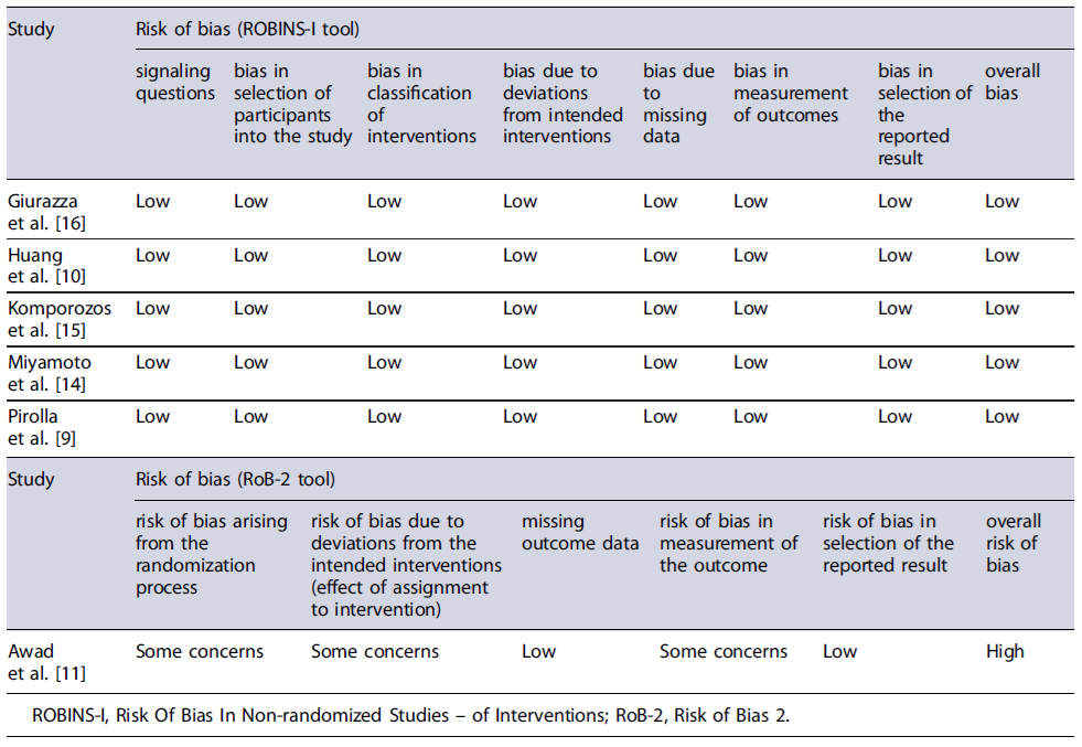 The selected studies underwent a quality assessment using either Risk of Bias 2 (RoB-2) tool [13] for randomized clinical trials (RCTs) or Risk Of Bias In Nonrandomized Studies - of Interventions (ROBINS-I) tool [12] for nonrandomized studies. The RoB-2 tool is divided into five potential sources of bias: bias arising from the randomization process, bias due to deviations from intended interventions, bias due to missing outcome data, bias in measurement of the outcome, and bias in selection of the reported result. After applying the tool, an overall risk of bias is determined, and the study is classified as Low risk of bias, Some concerns, and High risk of bias. The ROBINS-I tool evaluates studies across seven domains: bias due to confounding, in selection of participants into the study, in classification of interventions, due to deviations from intended interventions, due to missing data, in measurement of outcomes, and in selection of the reported result. A final risk of bias judgment is achieved and categorizes each study as Low, Moderate, Serious, Critical,or No information.
