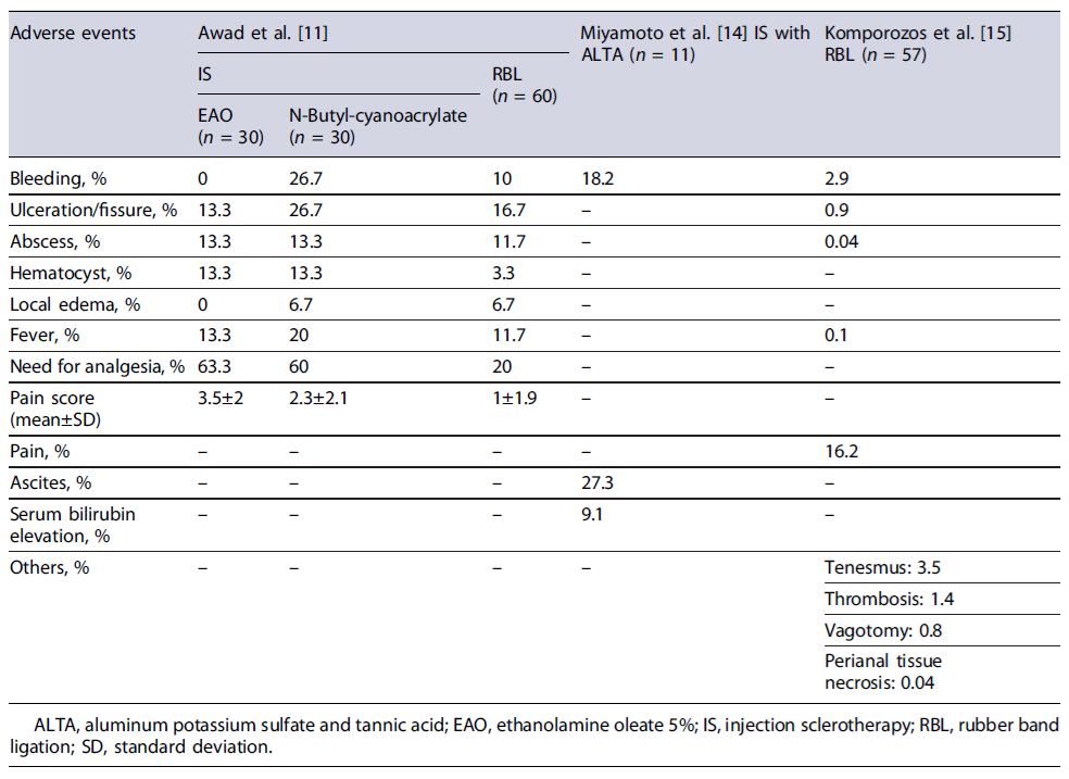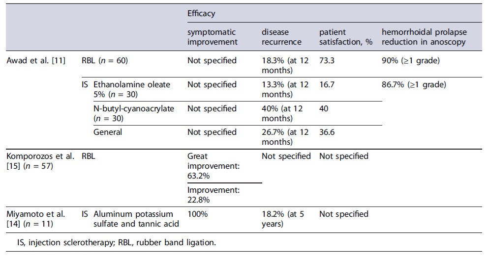 In the Miyamoto et al. [14] study, exclusion criteria were not specified, while Awad’s study excluded patients with thrombosed hemorrhoids, anal fistulas, or perianal abscesses. Miyamoto and colleagues [14] used ALTA as the sclerosing agent, while Awad et al. [11] divided patients into two subgroups using either EAO or N-butyl-cyanoacrylate.