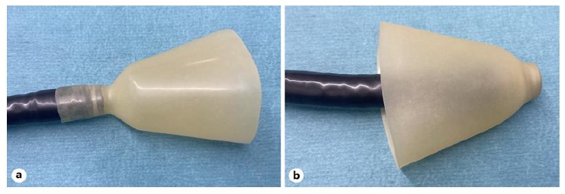 Fig. 1. a ENDOLINE®HOOD: it has a tip diameter of 8 mm, distal diameter of 40 mm, a length of 75 mm and can be easily attached to the tip of a conventional gastroscope. b Inverted ENDOLINE®HOOD, the way of intraluminal insertion.