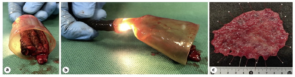 Fig. 3. a Gastric specimen inside the hood. b Lateral view of the ENDOLINE®HOOD, demonstrating the good adaptation of the device to the endoscope even with specimen weight. c Undamaged gastric specimen 100 × 68 mm in size.