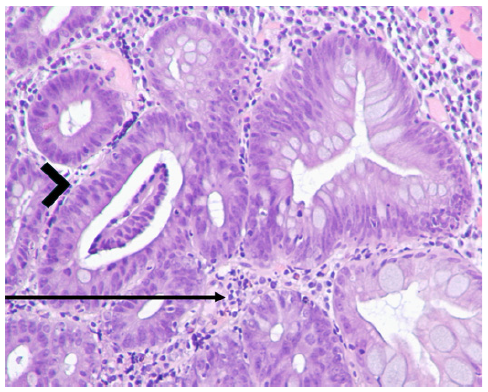 Fig. 2 Histopathological findings of gastric mucosa prior to discontinuing olmesartan, stained with hematoxylin and eosin (H&E), at ×100 magnification. Inflammatory infiltrate in the lamina propria (arrow), indicative of gastritis, and low-grade dysplasia (arrowhead) were present.