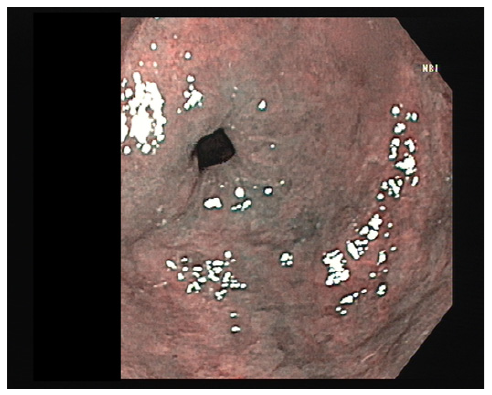 Fig. 3 Gastric antrum visualized using narrow band imaging (NBI) during upper gastrointestinal endoscopy, after stopping olmesartan.