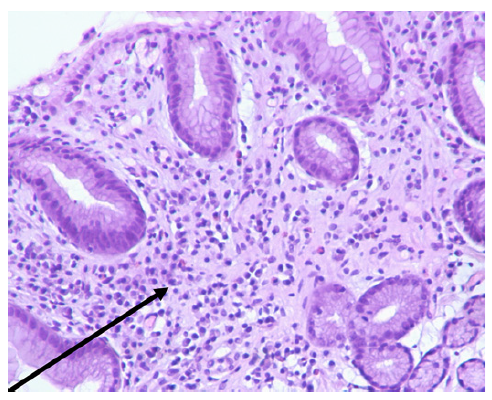 Fig. 4 Histopathological findings of gastric mucosa after discontinuation of olmesartan, stained with hematoxylin and eosin (H&E), at ×100 magnification. A reduction in the inflammatory infiltrate (arrow) was observed, indicating histological improvement.