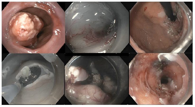 Fig. 2 Endoscopic submucosal dissection (ESD) procedure illustrating the initial lesion and key procedural steps, including the circumferential incision and submucosal dissection. This figure highlights the lesion at the start, the progression of the ESD, and the final appearance of the mucosal defect.
