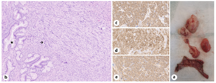 Fig. 3 Gastric leiomyosarcoma. a Retrieved specimen. b H&E showing normal gastric glands (*) and a fascicular spindle cell neoplasia (→) with marked cytological atypia and frequent mitosis. The neoplastic cells express smooth muscle immunohistochemical markers: actin (c), desmin (d), and caldesmon (e).