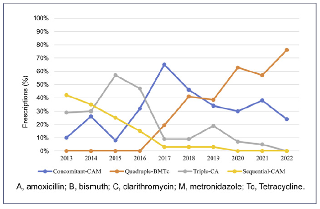 When evaluating the trends of H. pylori eradication success from 2013 to 2022 (Fig. 1), it was observed that the effectiveness, according to mITT, fluctuated along the years of the study. Figure 2 represents the evolution of the prescriptions between 2013 and 2022. The triple-CA therapy exhibited a declining trend after reaching its peak in 2019, with 0% prescriptions by 2022. A similar pattern was observed with sequential-CAM. Conversely, quadruple therapies, concomitant-CAM, and quadruple-BMTc were predominantly used since 2016, being the two most used regiments since 2017, with quadruple-BMTc being the top prescribed regimen since 2019 and reaching 76% of all prescriptions in 2022.