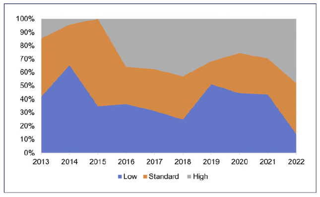 The trends in the prescription of PPI dosage are illustrated in Figure 3, reflecting a tendency towards an increase in the use of higher PPI doses and a decrease in standard and low doses between 2013 and 2022. In 2022, the rates for high versus standard versus low PPI doses were 48% versus 38% versus 14%, respectively. Also, trends regarding the length of prescription changed from mainly 7 days until the year 2016, where 10- and 14-day therapies became the preferred options. In 2022, these 2 lengths represented 86% of all prescribed regimens.