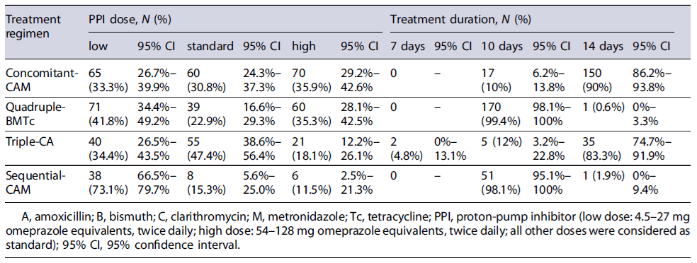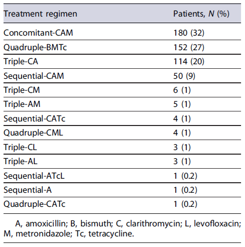 To ease the synthesis of information, our analysis focused on the 4 most frequently used treatments, defined as follows: triple-CA, sequential-CAM, concomitant-CAM, and quadruple-BMTc. Compliance with treat-ment was defined as taking at least 90% of the prescribed drugs.