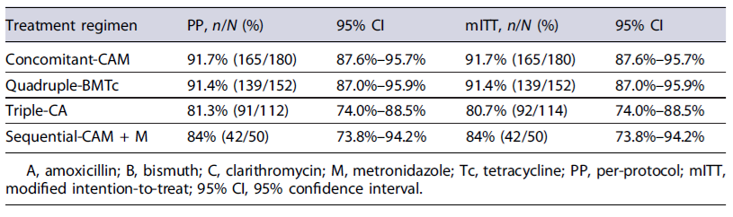 The mITT and PP effectiveness of each first-line treatment regimen are presented in Table 2. After confirming eradication with a validated diagnostic test, the overall effectiveness of H. pylori first-line eradication therapy was 87% by both mITT and PP. Concomitant-CAM (92%) and quadruple-BMTc (91%) obtained optimal (>90%) effectiveness.