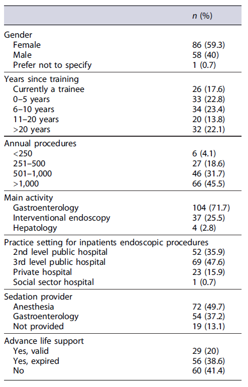A total of 119 gastroenterologists and 26 trainees (17.6%) responded to the survey, accounting for a response rate of 19.2% (145 of 755). The demographic characteristics of the respondents are presented in Table 1. Most respondents were female (59.3%, n = 86) and the time of practice among the attending gastroenterologists was evenly distributed. The volume of endoscopic procedures performed per year was high, with many respondents performing >1,000 endoscopic procedures annually (45.5%, n = 66). Twenty-six percent dedicated their activity to interventional endoscopy (e.g., advanced resection techniques, third-space endoscopy, endoscopic retrograde cholangiopancreatography, and interventional endoscopic ultrasound, n = 37) and 2.4%(N = 4) to hepatology. Most respondents performed inpatient endoscopic procedures in the public sector (83.5%, n = 121), and mainly in tertiary hospitals (47.6%, n = 69). Many reported performing endoscopic procedures with sedation provided by anesthetist (49.7%, n = 72). Many respondents did not have advanced life support certification (41.4%, n = 60) or their certification was expired (38.6%, n = 56).
