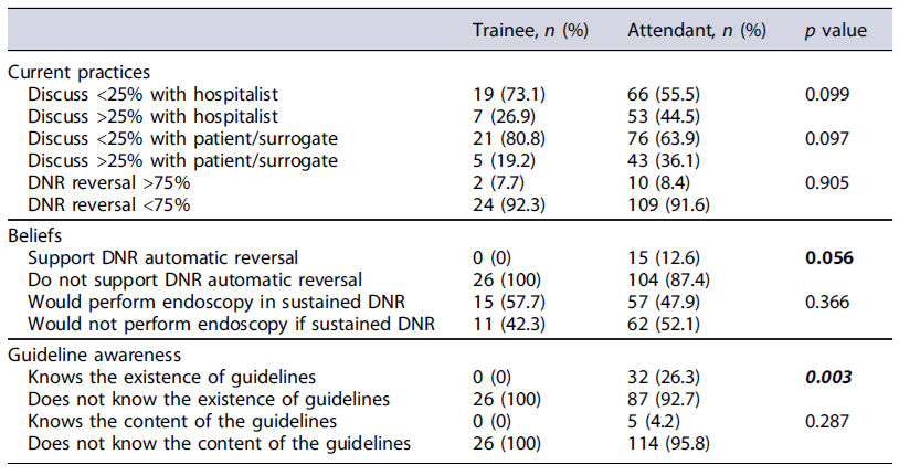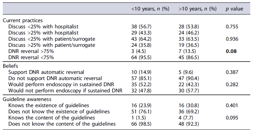 When compared to attendings, trainees were significantly less aware of the existence of guidelines about DNR reversal before invasive procedures (trainees 0%, attendings 26.3%, p = 0.003) and were less likely to support the automatic reversal of DNR; however, this trend did not reach statistical significance (trainees 0%, attendings 12.6%, p = 0.056) (Table 2). Gastroenterology attendings with more than 10 years of practice were more likely to reverse DNR orders before procedures, although without reaching statistical significance (<10 years 4.5%, >10 years 13.5%, p =0.08) (Table 3). Gastroenterologists who provided inpatient endoscopy in the private sector were significantly more aware of the existence of guidelines on DNR reversal before the procedures (public sector 19%, private sector 39.1%, p = 0.033), as well as of its content (public sector 1.7%, private sector 13%, p = 0.006) (Table 4). Interventional endoscopists reversed the DNR order significantly less frequently before procedures (non-interventionalists 11.1%, interventionalists 0%, p = 0.034) and were significantly more likely to be willing to perform a pro-cedure without a previous DNR reversal (non-interventionalists 44.4%, interventionalists 64.9%, p = 0.032)(Table 5). No significant differences were found between groups regarding having code status discussion with hospitalist and/or patient/legal representative before the procedure (Tables 2-5).