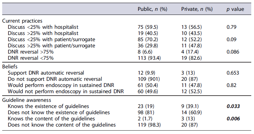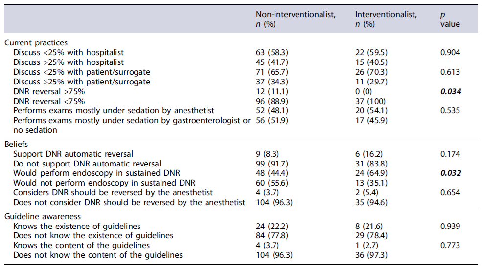 Despite the considerable divergence in terms of management, concepts, and guideline awareness across the gastroenterologists surveyed, some patterns of responses were identified. Trainees and gastroenterologists who perform inpatient endoscopy in the public sector have less knowledge of existing guidelines for periprocedural DNR reversal. Concerning the first ones, during residency, trainees might be more focused on learning and training the clinical aspects of their practice, often neglecting these ethical aspects yet with important medico-legal implications. Moreover, there is a difference in practice between gastroenterologists performing in-patient endoscopy in the public versus private sector, which may be in line with different medico-legal scenarios. However, despite the practice setting, the risk of life-threatening complications during endoscopic procedures always exists and the patient’s values and rights to self-determination should always be addressed. Finally, interventional endoscopists reported reverting the DNR decision less frequently and stated that more frequently they would perform endoscopic procedures with a sustained DNR status. This may be related to the perception that the code status should be managed by the anesthetist. Indeed, interventionalists stated that they performed more procedures with sedation by the anesthetist and were more of the opinion that the DNR status should be reversed by the anesthetist; however, these differences did not reach statistical significance (Table 5), which may be related to a small sample population.