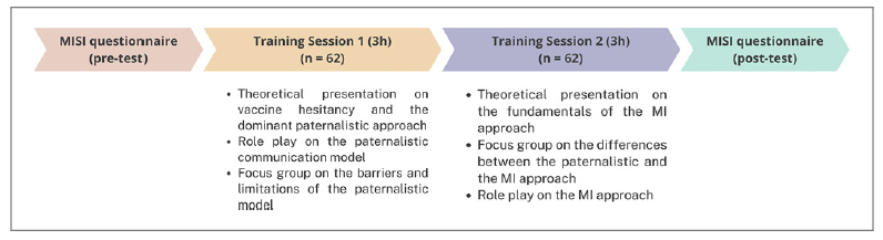 Educational training sessions on MI were conducted with healthcare professionals in Portugal to improve their communication skills in their interaction with vaccine-hesitant parents. The training was delivered in person by a sociologist and a social psychologist with previous training on immunization-specific MI. Activities were developed in two educational sessions, each one with a duration of 3 h, for a total of 6 h. In the first session, participants were provided with information on VH based on previous findings from the XXX project. A special focus was placed on the prevailing paternalistic communication model and its unsuitability in the context of VH. Following the theoretical presentation, three voluntary participants were asked to perform a play based on a cartoon depicting the interaction between a nurse and a couple with a baby in a vaccination setting where the paternalistic communication model was used 47. This activity was followed by a focus-group discussion about the main barriers to the interaction. In the second session, participants were presented with the fundamentals of the MI approach and its applicability to address parents’ concerns about their children immunization. After that, participants were provided with a cartoon depicting the same vaccination encounter as in the first session but, this time, the MI approach was used rather than the paternalistic one. The reading of this story was followed by a focus group about the main differences between the paternalistic model of communication and the MI approach. Finally, participants were divided into small groups, and they were asked to role-play using the MI approach based on a script of possible situations of VH and a brochure with written information about MI skills. The assessment of the training followed a pretest-post-test design as participants were asked to fill out the Motivational Interviewing Skills in Immunisation (MISI) questionnaire 25 at the beginning of the first session and at the end of the second one. The application of this written evaluation tool allowed us to assess participants’ MI knowledge and skills before and after the training took place. The following flowchart (Fig. 1) systematises the described MI training and assessment protocol.