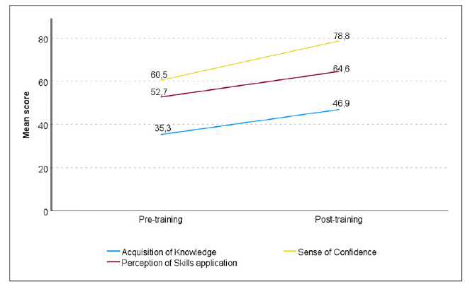 Analysing the mean scores obtained in the three parameters for assessing MI competencies, there is an increase in the average points on all dimensions between the two temporal points - i.e., before and after the training (see Fig. 2). Indeed, while the hierarchy of scores maintains, is noticeable the inflation in the mean scores between the pre- and post-training session stages. The largest increase in the average score is observed on the dimension of sense of confidence, with an increment of approximately 18 points. In the remaining two dimensions, Perception of Skills and Acquisition of Knowledge, the variation between stages is similar: a rise of nearly 12 points in both cases.