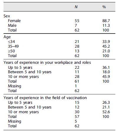 The study involved a total of 62 respondents: healthcare professionals (nurses and physicians) involved in the vaccination working on healthcare centres or in a public hospital and master students of community nursing who are already working as healthcare professionals. Most participants were female (88.7%). In addition, most respondents were aged between 35 and 49 years (45.2%), while approximately one-third of respondents were under 35 years old. Twenty-one per cent were 50 or over. Regarding the contexts of professional activity, almost half of the participants have more than a decade of professional experience in their current workplace (45.9%). In turn, 36.1% have a total experience of no more than 5 years - twice that of those with between 5 and 10 years (18%). Moreover, there is a prevalence of respondents whose direct professional contact with the field of vaccination extends to 10 years or more (52.6%). Approximately a quarter of the sample presents a professional trajectory in this medical domain that amounts to a maximum of 5 years (26.3%), followed by 21.1% between 5 and 10 years. The characterization of participants in the training can be found in Table 1.