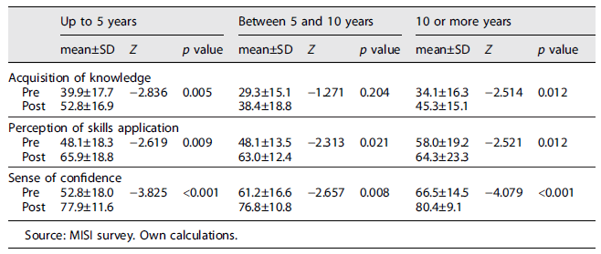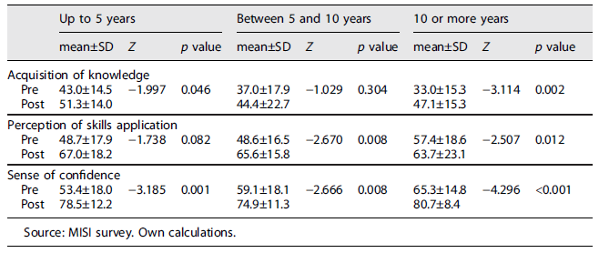 Additional comparative analyses were carried out to obtain a better understanding of the variations in the mean scores. In particular, the focus was on the sociodemographic variables related to the context of the participants’ professional activity resorting to Wilcoxon-Pratt tests. Firstly, there are significant differences in all parameters across the different groups according to years of experience in the respective workplace (see Table 3). The exception rests among respondents between 5 and 10 years, where the variation in the mean score before and after the training in MI is not significant for the dimension of acquisition of knowledge (Z = −1.271; p = 0.204).