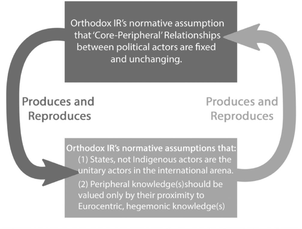 In this critical epistemological investigation of orthodox IR, it explored the ways in which orthodox IR predominantly validates epistemologies not on their own terms, but rather by their proximity to hegemonic knowledge(s), thereby disregarding peripheral Indigenous epistemologies. This epistemological bias, combined with orthodox IR’s state-centrism, has been shown to produce and reproduce, and in turn, be produced and reproduced by orthodox IR’s belief that core-peripheral relationships between international political actors are fixed and unchanging.