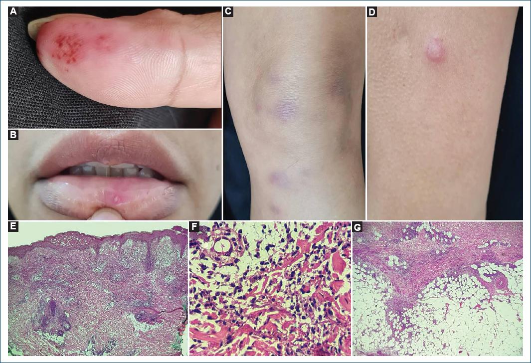 Figure 1 Patient 1 – petechiae over an erythematous plaque on the digital pulp of the first right finger (A), single aphthous lesion on the lower lip (B), erythematous-violaceous nodules on the lower limbs (C), and erythematous papules with hypochromic center and central pseudovesiculation located on the left arm (D). Histopathology from the arm with papillary dermal edema, perivascular and interstitial dermal infiltrate (H&E, 4×) (E), predominantly with neutrophils and leukocytoclasis (H&E, 40×) (F), and from the leg with septal panniculitis (H&E, 4×) (G).