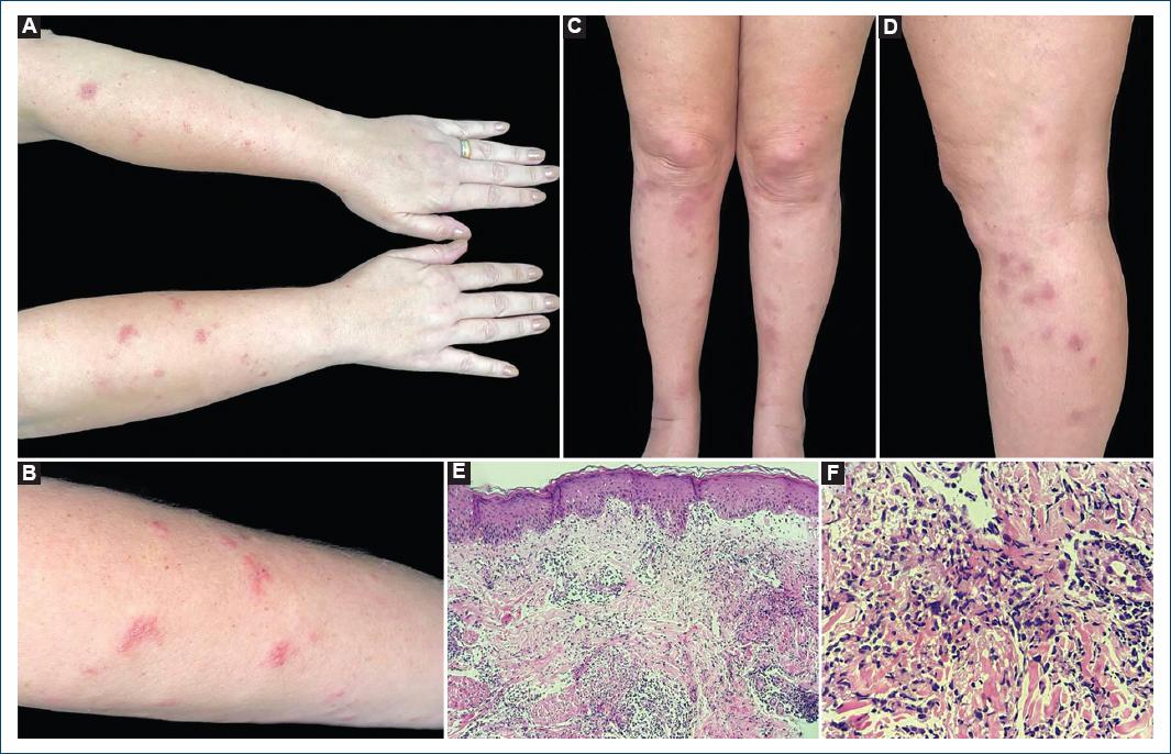 Case 2: a 41-year-old healthy female presented with painful erythematous-edematous papules and plaques with a vesicle-like appearance on the upper limbs, as well as painful erythematous-violaceous nodules on the lower limbs (Fig. 2) that appeared 1 week after COVID-19 and influenza vaccination, associated with fever (max 38.3 °C) and arthralgia. The patient had no alterations in serologies and other blood tests, except an elevated ESR (38 mm/h) and protein electrophoresis with asymmetrical distribution of the γ fraction. Histopathology of one of the lesions on the forearm confirmed the hypothesis of SS. Lower limb lesions were clinically diagnosed as EN.
