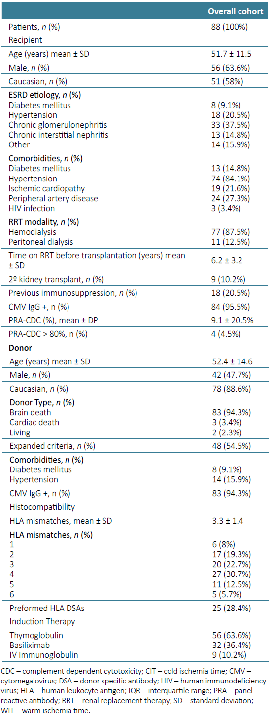 There were 88 patients submitted to kidney transplant during this period. Mean age was 51.7 ± 11.5 years, 56 (63.6%) were male, 51 (58%) were Caucasian, 13 (14.8%) were diabetic and 74 (84.1%) had arterial hypertension. Nine (10.7%) patients received a second graft and 17 (19.3%) were previously treated with immunosuppression. Mean CDC‑PRA was 9.1% ± 20.5%. Four patients (4.5%) were highly sensitized (CDC‑PRA >80%). Two (2.3%) donors were living donors, 83 (94.3%) brain‑dead donors and 3 (3.4%) donors after cardiac dead Maastricht II. Mean donor age was 52.4 ± 14.6 years and mean HLA mismatches 3.3 ± 1.4. Seven patients (8 %) had 1 HLA mismatch, 17 (19.3%) had 2, 20 (22.7%) had 3, 27 (30.7%) had 4, 11 (12.5%) had 5, and 5 (5.7%) patients had 6 HLA mismatches. Twenty‑five (28.4%) patients had pre-formed DSA. The induction immunosuppression included thymoglobulin in 56 (63.6%) patients and basiliximab in 32 (36.4%). Nine patients with PRA‑CDC > 50% or pre‑formed DSA were treated additionally with IV immunoglobulin (Table 1). Mean cold ischemia time (CIT) was 11.2 ± 5.1 hours and warm ischemia time (WIT) 27.6 ± 7.4 minutes. Twenty‑five (28.4%) patients presented delayed graft function and required at least one HD session in the first week after transplantation.