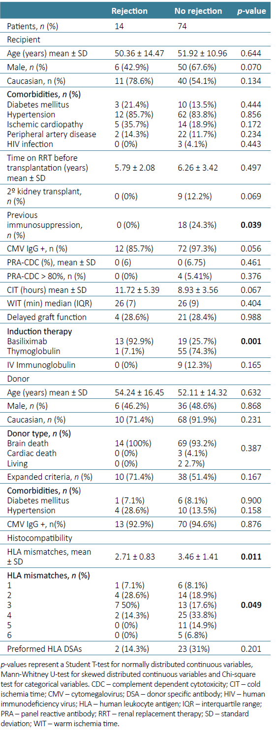 Kidney transplant is the treatment of choice to end‑stage renal disease (ESRD), improving patient´s morbidity and mortality compared with other renal replacement therapies (RRT) such as hemodialysis.1 Advances in immunosuppressive therapies have substantially reduced the incidence of acute rejection in the past three decades. Acute rejection rates have steadily declined from nearly 100% in the first half of the 20th century to approximately 10% more recently.2 Acute rejection remains, however, one of the main causes of graft loss. In fact, understanding the factors affecting graft rejection can help to estimate the probability of immunologic graft damage, and accurately identify the type and severity of acute rejection, while guiding appropriate treatment and promoting graft survival. Multiple factors have been proposed in the literature, including pre-surgery factors related to donor and recipient characteristics such as age, sex, race, HLA mismatches and preformed donor specific antibodies (DSA),3,4 peri‑operative parameters such as cold and warm ischemia times,5,6and post‑operative immunosuppressive treatment.7 Tissue biopsy remains the gold standard for evaluating immunologic graft damage. Histology is interpreted using the Banff classification of kidney allograft pathology, which has undergone extensive updating and revision since its development in the 1990s. The diagnostic criteria for T cell-mediated rejection have undergone little change in recent years, and include lymphocytic infiltrate of tubules (tubulitis) and larger vessels (vasculitis), with the severity of these lesions depending on the degree of lymphocytic infiltrate per high‑powered field.8 The aim of our study was to determine the incidence and assess risk factors for acute T‑cell mediated rejection (TCMR) and borderline rejection diagnosed in early protocol kidney transplant biopsies.