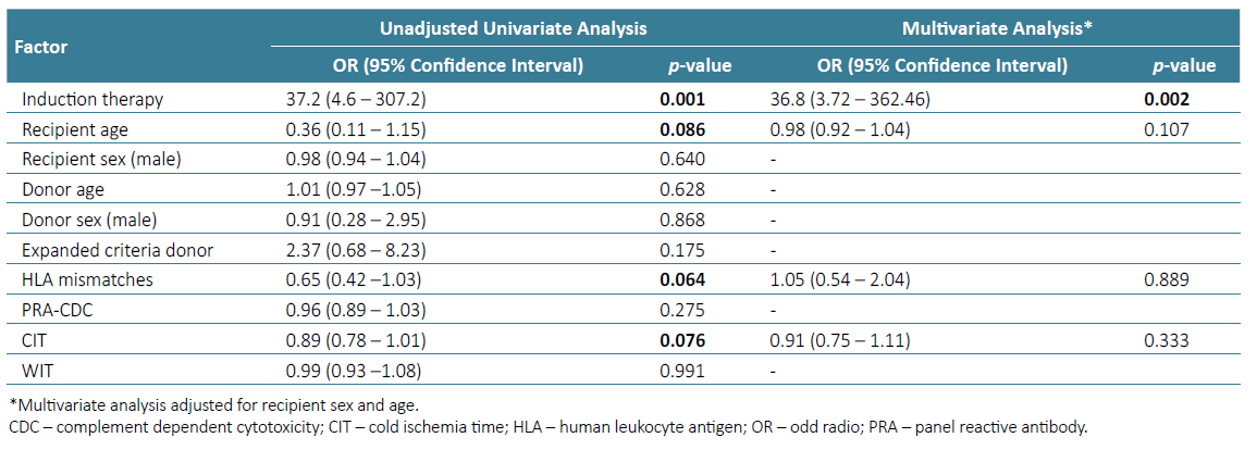 In a multivariate logistic regression analysis, adjusted for recipient age and sex, only induction therapy with basiliximab remained a strong predictor of early acute rejection [(OR) 36.8 (CI: 3.72 - 362.46), p=0.002].