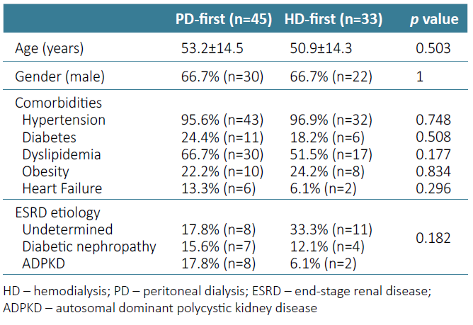 From the 78 patients, 33 (42.3%) initiated RRT with intermittent HD and switched to PD after a median time of 3 months (interquartile range (IQR 2‑4.5)). The main reason found to go through a HD period was the need for urgent start of RRT (84.8%; n=28), in the setting of an acute kidney injury in patients with chronic kidney disease (CKD) due to an acute event, such as infection or cardiovascular event. Other causes for HD to PD transition were: change of patient’s option after HD start (9.1%, n=3) and PD catheter’s malfunction at the moment of PD start that could not wait for the surgical revision (6.1%, n=2). Most of this sub‑population had previous follow‑up by a nephrologist (82.1%, n=23) and had received specific education on the different RRT available (69.6%, n=16) and had chosen PD, so they started HD using a central venous catheter. All PD‑first patients started in a programmed setting and no urgent PD starts were registered.