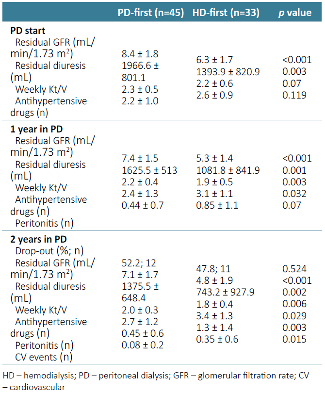 Given that, the primary objective of our study was to evaluate the impact of an initial period on HD before transitioning to PD on clinical, analytical and treatment related outcomes, one and two years after the beginning of RRT, since studies directly comparing these two groups of patients are lacking.