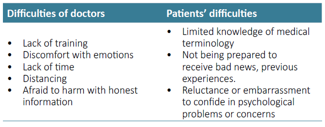 Effective communication implies, in addition to sharing information, other factors such as non‑verbal communication, listening, clarification, argumentation, persuasion, negotiation, reinforcement and reflection. It plays an important role in facilitating adaptation to the reality of living with a serious illness. Effective communication between patient and medical team is essential. Basic communication skills are needed to achieve good results in patient‑centered care, to understand what is important to the patient and to increase their participation in their own care.9