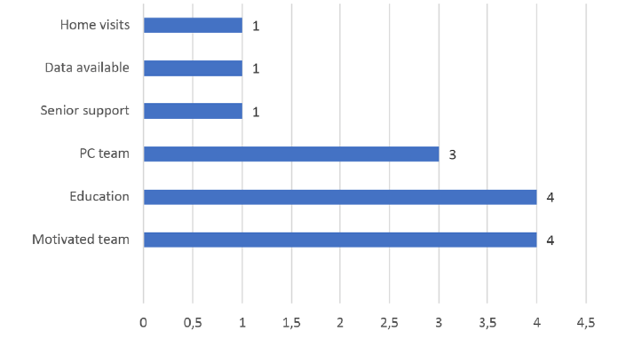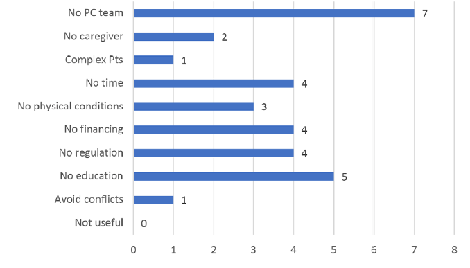 Fig. 2 shows the solutions that were proposed, the most important being having a motivated team (n=4, 27%) and having education in palliative care (n=4, 27%). Having a link to a supporting palliative care team was also mentioned.