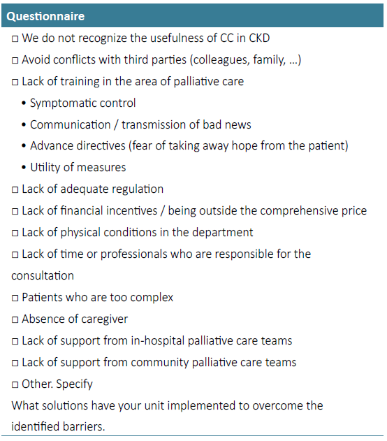 The Conservative Care Working Group (CC WG) of the Portuguese Society of Nephrology (Sociedade Portuguesa de Nefrologia) set out to identify barriers to the implementation of Conservative Care Programs and to find solutions. To do so, a questionnaire was sent to all Nephrology departments and an open meeting was organized, whose results we report in this paper.