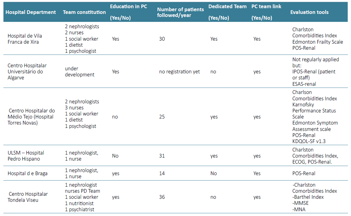 Table 3 contains the main characteristic of the participating programs (n=6). The majority (n=4, 66%) have professionals with intermediate to advanced education in palliative care even if the team is not dedicated mainly to conservative care (n=3, 50%). All programs have simultaneous doctor and nurse patient assessment. How other professionals participate (nutritionist, social worker, psychologist) varies between programs.