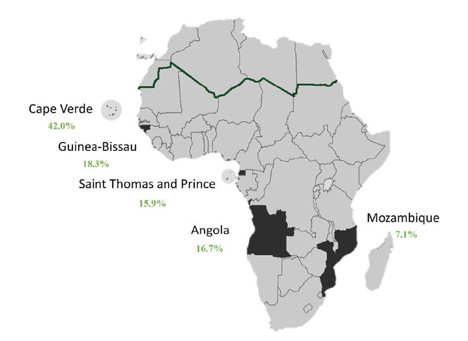 A total of 126 African patients underwent chronic hemodialysis at the HD unit of Centro Hospitalar Universitário Lisboa Norte. Baseline characteristics of this cohort are described in Table 1. Mean age was 49.9 ± 14.1 years, and the majority was male (n= 71, 53.6%). Twenty‑one patients came from Angola (16.7%), 53 from Cape Verde (42.0%), 23 from Guinea‑Bissau (18.3%), 20 from Saint Thomas and Prince (15.9%), and 9 from Mozambique (7.1%) (Fig. 1).