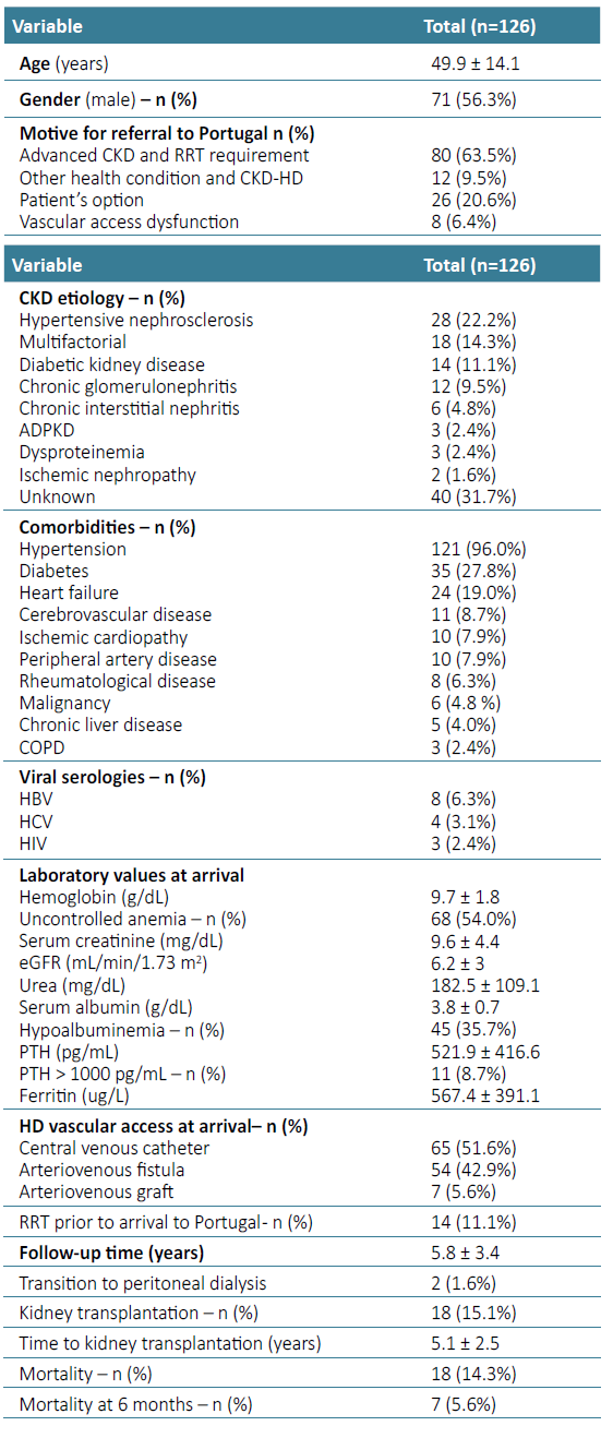 Data was obtained from individual papers and electronic clinical records. The following variables were collected: demographic characteristics (age, gender, race, born country); CKD etiology; Comorbidities [diabetes, hypertension, cerebrovascular disease (CVD), heart failure, ischemic cardiopathy, chronic obstructive pulmonary disease (COPD), chronic liver disease, peripheral artery disease, rheumatological disease and/or active malignancy]; motive of referral to Portugal (RRT requirement, including urgent RRT, other health condition in a patient with CKD on HD, and patient’s option; and vascular access (VA) dysfunction); viral serologies (human immunodeficiency virus (HIV), hepatitis B virus (HBV), hepatitis C virus (HCV); laboratory values at arrival to Portugal [hemoglobin (Hb), serum creatinine (SCr), estimated glomerular filtration rate (eGFR), serum urea, serum albumin, serum ferritin, serum parathyroid hormone (PTH), C‑reactive protein (CRP)]; HD vascular access at admission and at the end of the follow‑up [central venous catheter (CVC), arteriovenous fistula (AVF), arteriovenous graft (AVG)]; RRT prior to arrival to Portugal. We also analyzed the rate of patients transferred to peritoneal dialysis and/or who underwent kidney transplantation, the time to kidney transplantation when appliable and the mortality rate during follow‑up. Data collection was made in January/2021.