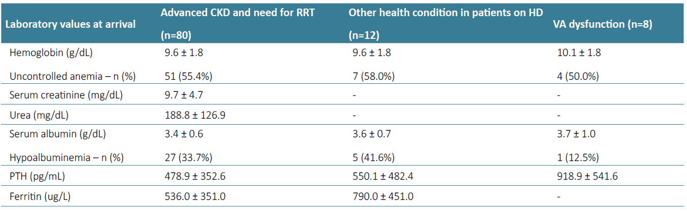 Patients who came due to other health condition and were already on regular HD in their country (n=12), had mean Hb 9.6 ± 1.8 g/dL, with 58.0% having uncontrolled anemia (n=7), ferritin 790 ± 451 ug/L, serum albumin 3.6 ± 0.7 g/dL, with 41.6% having hypoalbuminemia (n=5), and PTH 550.1 ± 482.4 pg/mL. In this group of patients, five already had an AVF and the remaining 7 had a CVC as VA for HD. During follow‑up in our center, three patients were submitted to construction of an AVF and 1 of an AVG. Three patients still had a CVC at the end of follow‑up.