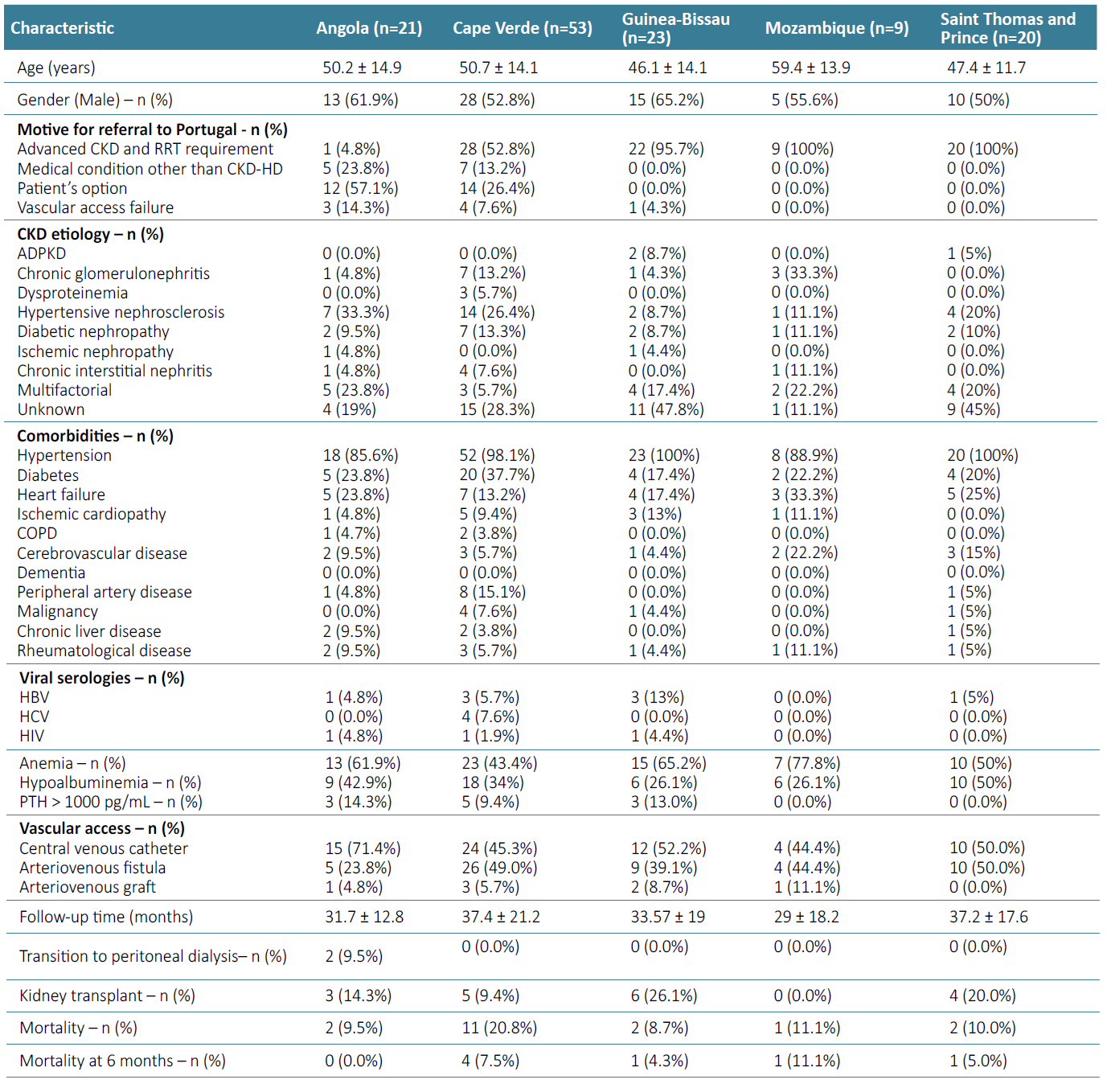 This is the first study presenting the clinical characteristics and outcomes of ACPOL hemodialysis patients in Portugal. Most of these patients come due to a cooperation protocol between countries, in need of RRT and due to VA dysfunction. Still, a significant proportion of CKD patients come to Portugal on their own. All of these patients started HD with a CVC, which is widely known to be associated with mortality. With the cooperation protocol, Portugal provides with RRT, treatment of the CKD complications, adequate VA care, possibility of peritoneal dialysis and kidney trans‑ plantation to ACPOL patients. Nevertheless, the corner‑stone to improve these patients’ quality of life and survival is a proper investment in African countries’ healthcare, financial and educational, namely regarding CKD management and ESRD.