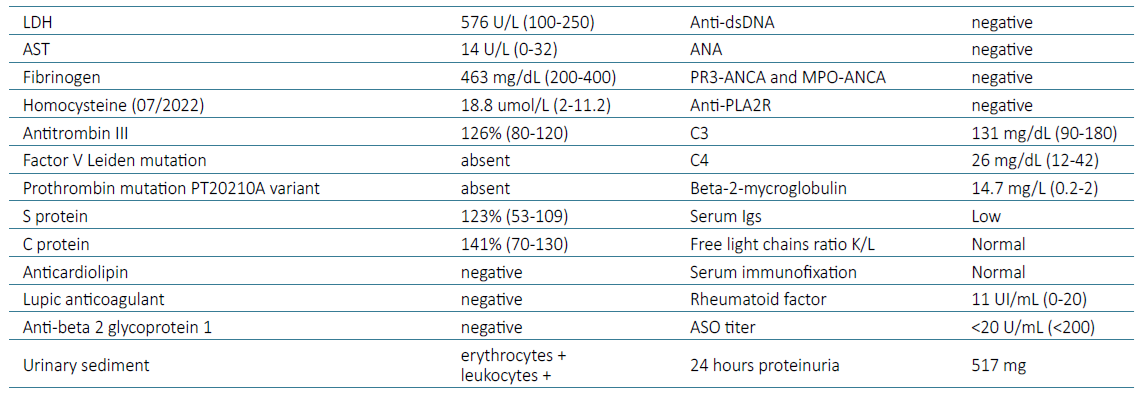 The patient was admitted for further investigation of severe AKI and upper gastrointestinal bleeding. At admission, a renal ultrasound was performed, and documented right kidney atrophy, with 6 cm bipolar axis, and left kidney with 9.5 cm of bipolar axis and reduction of the parenchymal width proportional to the reduced kidney dimension, with preserved sinusal parenchyma; no hydronephrosis or peri‑renal fluid present. These findings led to an abdominal‑pelvic computed tomography with intra‑venous contrast (five days after admission) that revealed right renal artery occlusion with an atrophic ipsilateral kidney (5 cm) as well as left renal artery occlusion with a spontaneous hyperdense thrombus associated with a left kidney size of 7 cm, with contrast enhancement maintained only on its superior pole, in relation with a permeable accessory renal artery (Fig. 1). The case was discussed with Vascular Surgery who deliberated that there was no indication for surgical or endovascular intervention, since the right kidney had already evidence of atrophy and the left arterial renal thrombosis occurred at least 5 days before and was deemed irreversible. Laboratory investigation is presented in Table 1. Prothrombin time, partial thromboplastin time and platelet counts were normal. Investigation of hereditary thrombophilia was negative (Table 1), and there was no family history of arterial or venous ischemic disease.