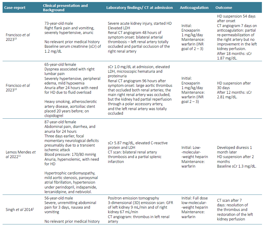 There are few cases of bilateral renal artery thrombosis with renal recovery treated only with anticoagulation monotherapy described in literature (Table 2). All of them used warfarin as the maintenance anticoagulation of choice. Francisco et al presented one case of bilateral renal artery thrombosis, documented 48 hours after symptom onset, which lead to anuric AKI. The patient became HD‑dependent and was discharged with maintenance warfarin treatment. Progressive recovery of kidney function was observed, and, after 54 days, HD was suspended.13 Also, Lemos Mendes et al published a case of an 87‑year‑old woman with bilateral renal artery thrombosis, admitted with abdominal pain, diarrhea, and anuria, for the last 24 hours. Lab work at admission showed sCr 5.9 mg/dL, urea 100 mg/dL, and HD was initiated due to fluid overload. Anticoagulation was started, first with low‑molecular‑weight heparin, and then warfarin. One month later, the patient developed diuresis and, two months later, she no longer required dialysis, with nadir sCr of 1.3 mg/dL.11 After nine months of anticoagulation with apixaban, our patient presented progressive improvement of diuresis and HD was suspended. To our knowledge, this is the first case of renal artery thrombosis, treated with apixaban on monotherapy, presenting with renal function recovery. The safety profile and a more suitable administration made apixaban the choice for our patient. More studies are needed to define the most safe and effective oral anti‑coagulant in these cases, as well as the timing to initiate it and for how long it should be maintained. 4