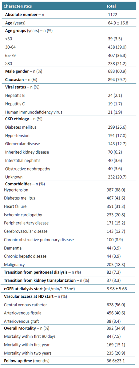 A total of 1122 patients who started HD in the chosen period were included. The baseline characteristics are described in Table 1. The mean age of the population was 64.9 ±16.8 years with 21.2% of patients being at least 80 years old. Sixty percent were male and 79.7% caucasian. The most common CKD etiology was diabetes mellitus (26.6%) followed by unknown causes (20.7%) and hyper‑ tension (17.0%). There was a large prevalence of hypertension (88.0%), diabetes mellitus (41.6%), heart failure (31.3%) and ischemic cardiopathy (20.8%). Concerning viral serologies, hepatitis B, hepatitis C and HIV were present in 2.1%, 1.7% and 1.9% of patients, respectively. At HD start, mean eGFR was 8.98 ±5.66 mL/min/1.73 m2. Eighty‑two (7.3%) patients transitioned to HD from peritoneal dialysis and thirty‑seven (3.3%) had a previous kidney transplantation. Regarding vascular access at HD start, 56.0% had a central venous catheter, 40.6% an arteriovenous fistula and 3.4% a arteriovenous graft. Mean follow‑up was 36.6 ±23.1 months. During this follow‑up, 392 patients (34.9%) died. Mortality within the first 90 days of starting HD was registered in 7.5% of patients (n=84).