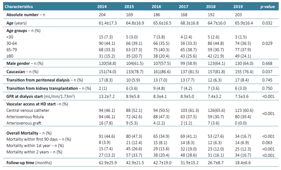 The number of patients that started HD per year varied between 169 in 2015 and 204 in 2014. The yearly patient characteristics are described in Table 2. The mean age of patients has increased significantly throughout the years (61.4 to 65.9 years, p=0.032), and the percentage of patients over 64 (48.5% in 2014, 58.0% in 2015, 60.7% in 2016, 64.3% in 2017, 52.6% in 2017, 62.0% in 2019) and over 80 (15.2% in 2014, 20.7% in 2015, 20.4% in 2016, 25.6% in 2017, 21.9% in 2018, 24.1% in 2019) increased significantly over the years (p=0.029). Furthermore, patients started HD with progressively lower eGFR, from 13.2 ±7.2 mL/min/1.73 m2 in 2014 to 7.5 ±3.6 mL/min/1.73 m2 in 2019, which was statistically significant (<0.001). Considering vascular access at HD start, the percentage of patients with central venous catheter increased (46.1% in 2014, 52.1% in 2015, 50.5% in 2016, 61.3% in 2017, 65.6% in 2018, 60.6% in 2019), while the percentage of patients with arteriovenous fistula and graft decreased (p<0.001). There was a trend for mortality rate reduction within the first 90 days (p=0.063) and a significant decline in mortality rate within the first years (p<0.001) over the years.