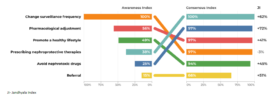 In question 4, the use of nephroprotective drugs has a high CI, but a low AI. Training courses and interdisciplinary meetings in which the different specialties involved in the diagnosis and treatment of CKD can discuss strategies and create therapeutic algorithms adapted to the characteristics of subgroups of patients should be promoted. For example, it would be important to have pain management protocols for patients with chronic pain. In these protocols, nephrotoxic drugs with analgesic effects, such as NSAIDs, would be avoided and in patients with regular and high consumption of NSAIDs, regular CKD screening should be considered.