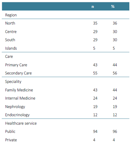 A total of 100 physicians from all Portuguese regions, from different clinical settings and with different specialties were recruited using convenience sampling via professional networks and were invited to participate in the study between March and May of 2022. Of these, 98 participated in the Awareness Round (Supplementary Table 1) and 96 participated in the Consensus Round, two weeks later (44 from primary care ‑ Family Medicine; and 52 from secondary care ‑ 23 of Internal Medicine, 18 of Nephrology and 11 of Endocrinology). The results were evaluated in two groups: primary care and secondary care. To be included, participants had to have experience in scientific production and have CKD as an area of interest.