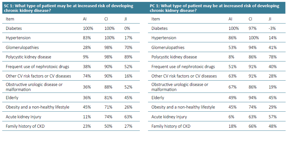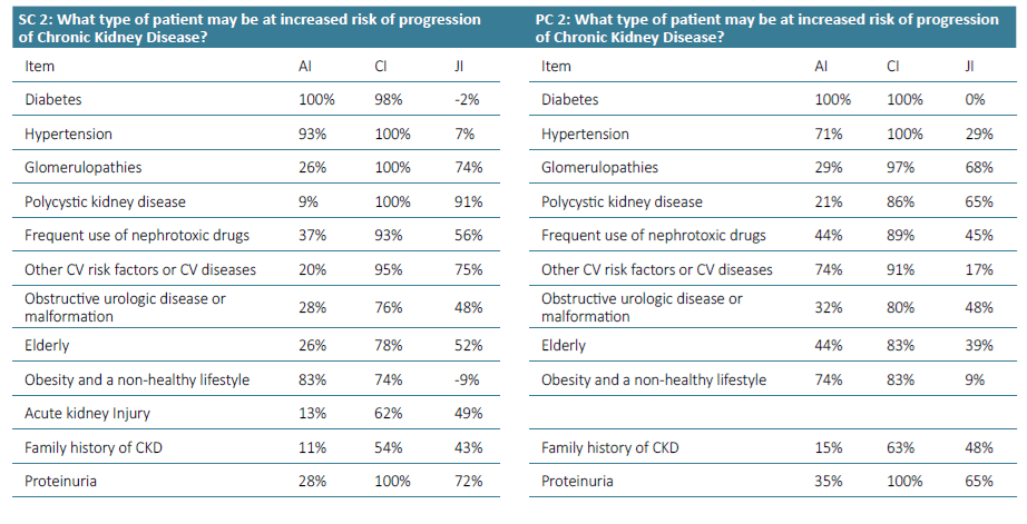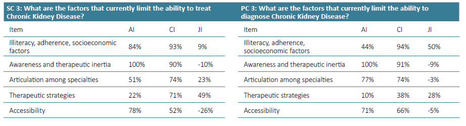 In question 3, awareness and therapeutic inertia had a high AI and CI, which represents a recognition of sometimes inadequate perception of the problem by colleagues and failure to apply appropriate diagnostic measures. More‑ over, the intrinsic limitation of creatinine and GFR formulas to detect incipient forms of CKD (particularly in elderly, highly comorbid and malnourished patients) and low adherence to serial assessment of proteinuria are aspects to be taken into account. Therapeutic strategies had a low AI in both groups, but especially in the primary care. While both primary and secondary care physicians are involved in both diagnosis and treatment processes, their day‑to‑day activities differ. Primary care focuses on early detection, ongoing monitoring, and initial management of CKD to ensure timely and accurate diagnoses. In this sense, therapeutic strategies play a minor role in the diagnostic capacity of CKD. In contrast, secondary care, concentrates on advanced treatment adjustments and managing complications. Understanding these distinct but complementary roles is crucial for optimizing CKD management across the healthcare continuum. Therefore, there is a need to strengthen communication between these two players. Promoting internships and training programs in Nephrology departments and in Primary care facilities for medical students and overall healthcare professionals, along with continuous education opportunities, can enhance practical knowledge and skills in CKD diagnosis and management. Additionally, mobile health applications can help patients monitor their health, receive medication reminders, and access educational content, supporting self‑management and treatment adherence. Utilizing electronic alerts to signal the achievement of a certain GFR threshold and easier and quicker referrals to nephrology is also a strategy to be considered.