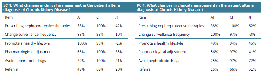 Regarding question 4 ‑ What changes in clinical management in the patient after a diagnosis of chronic kidney disease? ‑ in primary care, prescribing nephroprotective drugs, avoiding nephrotoxic drugs and referral had a low AI and a higher CI and Index Score, while in secondary care, the index scores were much lower (Figs. 7 and 8).