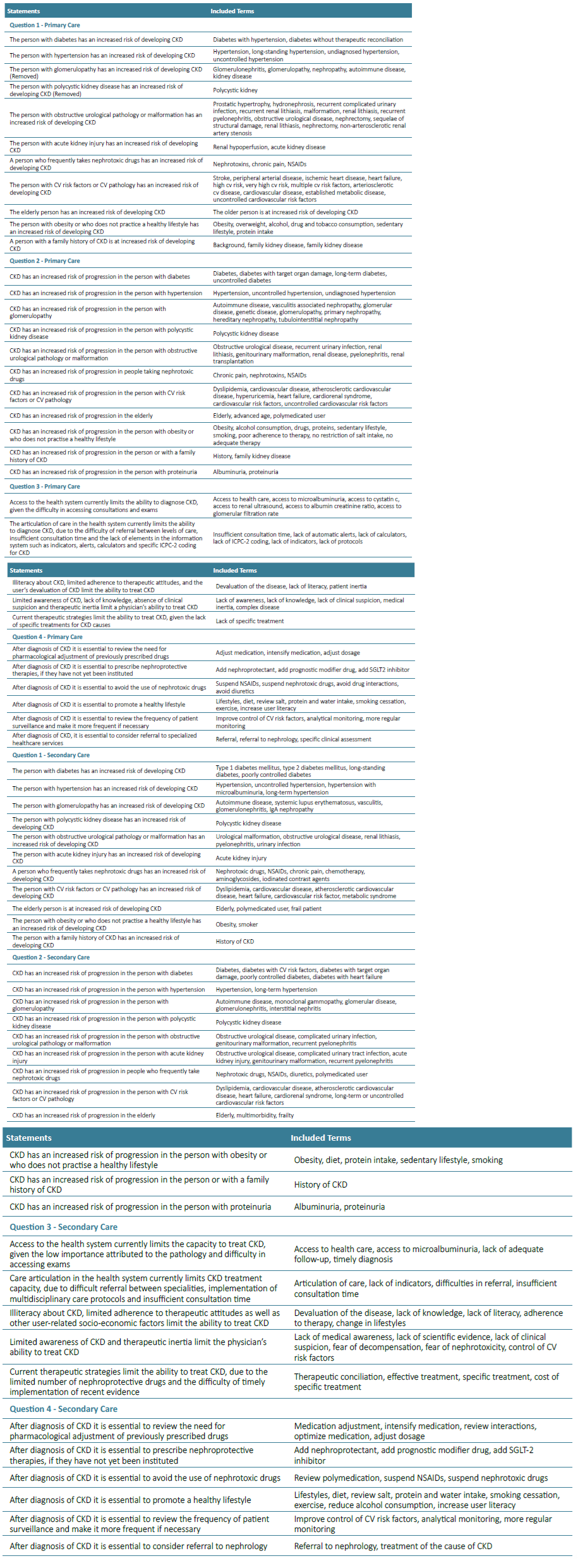 In general, the results showed a low awareness of some diseases, such as polycystic kidney disease, although it is responsible for 10% of end ‑stage renal disease (ESRD).41 We consider that its low frequency, hereditary nature, and high family clustering may lead to early referral to nephrology appointment, so non‑nephrologist colleagues may follow a reduced number of patients with this disease. The same circumstance may happen with some glomerulopathies, which are important causes of ESRD, but had a low AI in questions 1 and 2. Another explanation is the fact that these entities are considered to be chronic kidney diseases themselves and many participants did not refer to them in the Awareness Round, because they considered them part of CKD, leading to a false low AI. Development and progress may be misleading terms and there were different interpretations of the first question. Therefore, the items of polycystic kidney disease and glomerulopathies were removed from the Consensus Round in the first question.