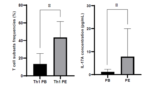 The comparison of blood and PE shows that the frequency of Th1 cells was significantly higher in PE (p<0.001) (Fig. 2). The frequencies of the remaining immune cells were similar in blood and PE, with PE closely resembling peripheral blood numbers (Supplementary Material).