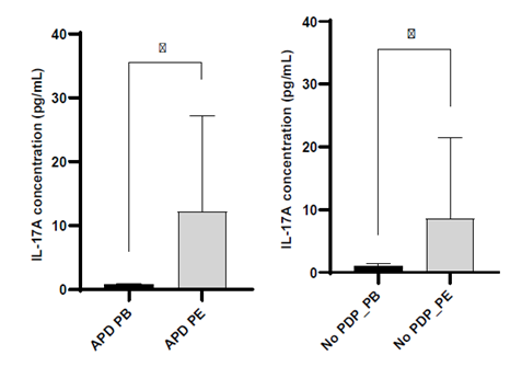 Blood levels of IL‑17A were similar between PD patients and controls (Supplementary Material). Although a trend towards a reduced percentage of Th17 cells was observed in the blood of PD patients, this finding did not translate into differences in serum IL‑17A concentrations. However, IL‑17A levels were significantly increased in the PE (p=0.039) (Fig. 2), despite a similar percentage of Th17 cells in blood and PE. This pattern of increased IL‑17A in PE was independent of daily glucose exposure, the use of icodextrin, previous history of peritonitis and PSTR. How‑ ever, for patients on APD, increased levels of IL‑17A were seen in the PE (Fig. 3).